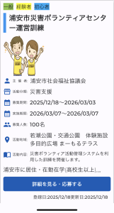 ⑥災害ボランティアセンター運営支援者養成講座を選択し応募するをタップ